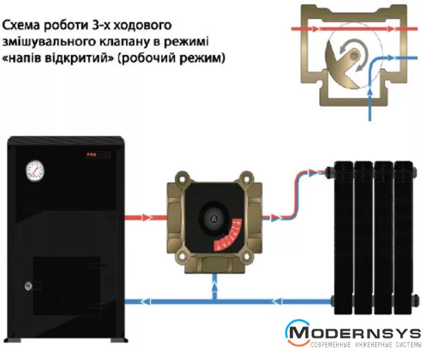 Необхідна температура в системі досягається за допомогою додавання необхідної кількості рідини, що надходить із зворотного трубопроводу, і подається в котл.