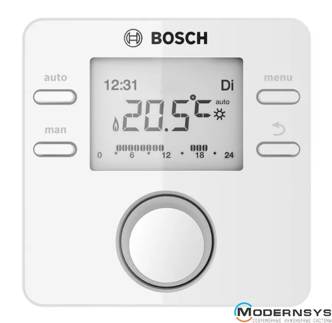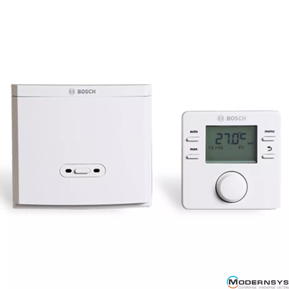 Терморегулятор Bosch CR100 RF (MB RF) – це бездротовий кімнатний термостат із сигнальним модулем MB RF для керування роботою опалювального котла залежно від температури у приміщенні. Може використовуватися як автономний пульт керування кімнатною температурою та для дистанційного керування, якщо в системі використовується кілька опалювальних контурів. Підтримується підключення до чотирьох регуляторів CR100 RF в одній системі.