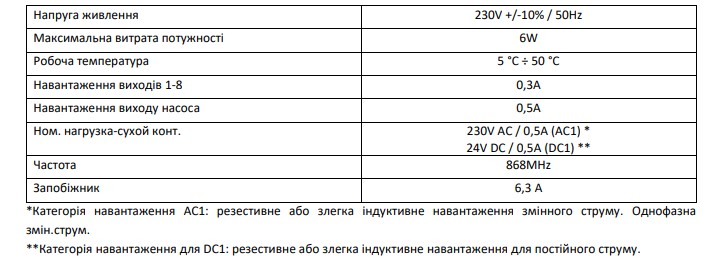 Технічні характеристики: Бездротовий контролер термоелектричних клапанів Tech (Теч) L-8е