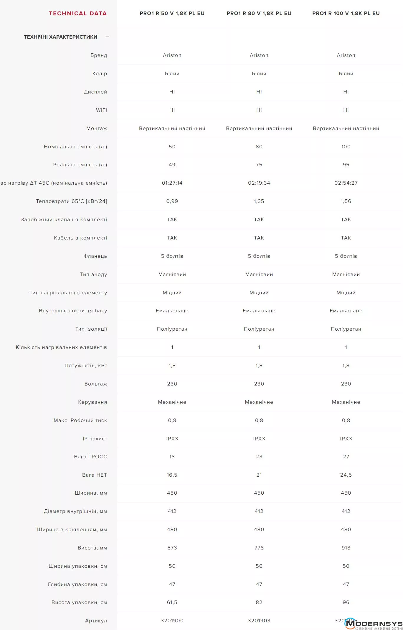 Технічні характеристики: Бойлер Ariston (Аристон) PRO1 R 80 V 1,8K PL EU