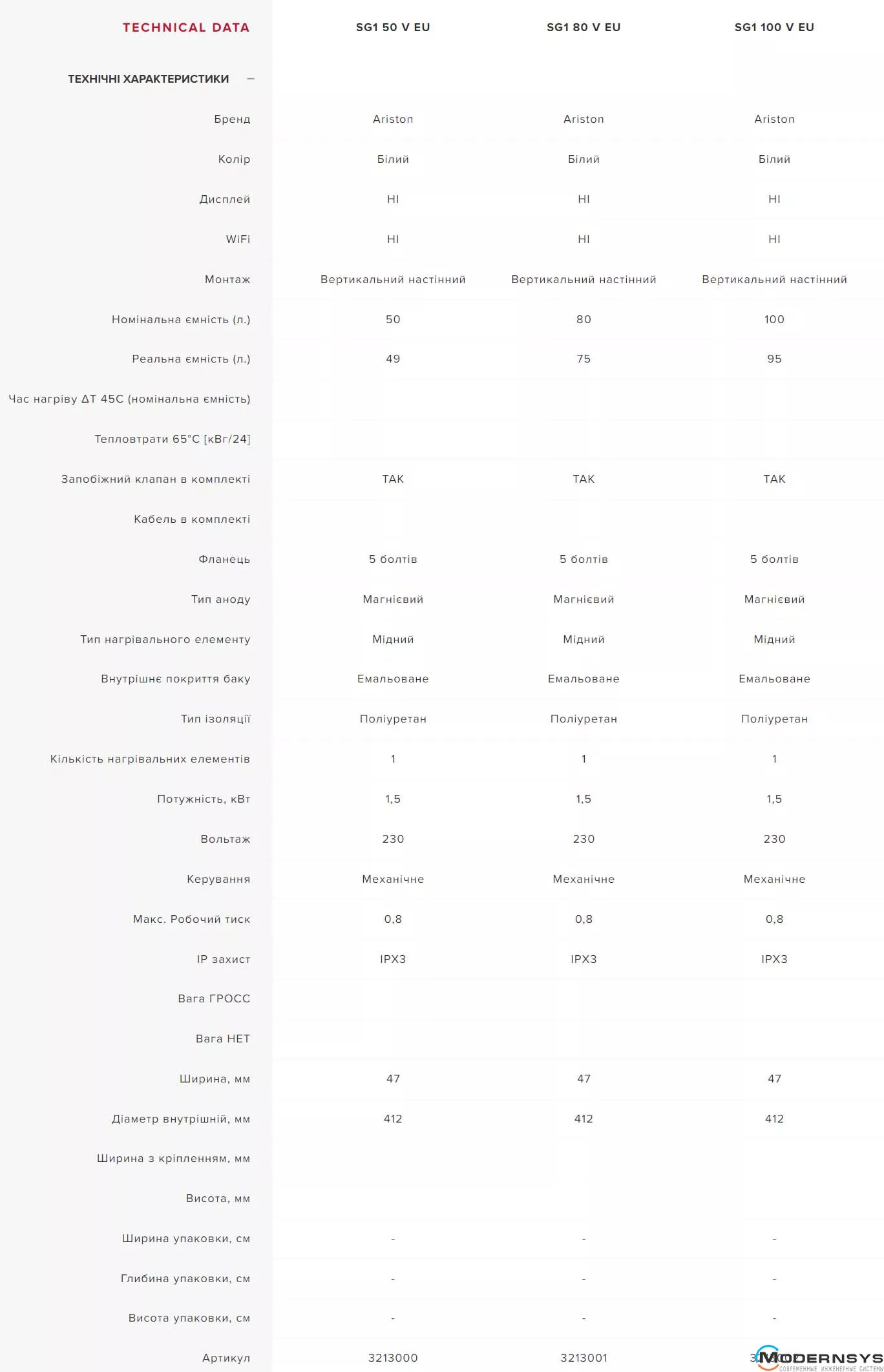 Назва товару КОД Обсяг (л) Ціна Бойлер Ariston SG1 80 V EU 0000739735 741 грн Бойлер Ariston SG1 100 V EU 0000739746 094 грн Бойлер Ariston SG1 50 V EU 0000739725 387 грн