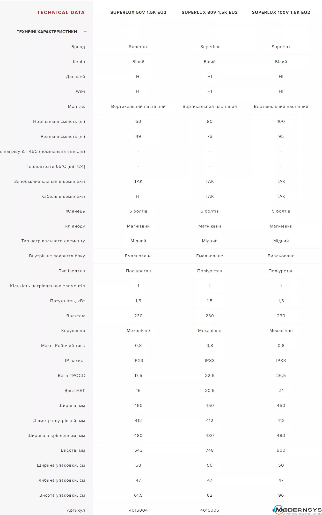 Технічні характеристики: Бойлер Ariston (Аристон) SUPERLUX 50V 1,5K EU2