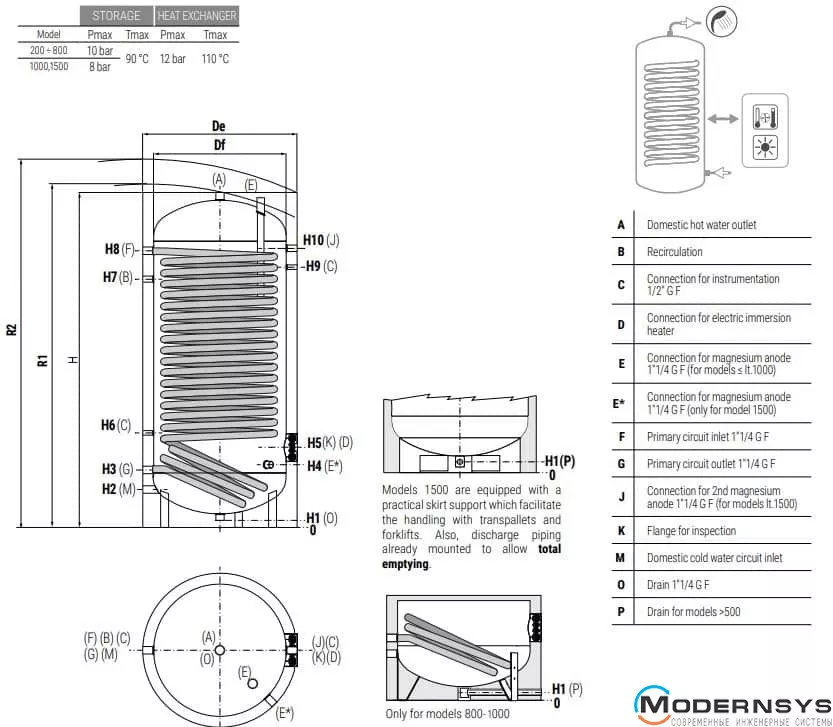 Модель оснащена одним збільшеним теплообмінником площею 4,4 м² , що забезпечує відмінну теплопередачу від джерел тепла з низькою температурою подачі, таких як тепловий насос, сонячний колектор або конденсаційний котел. Передбачена можливість встановлення електричного ТЕНу потужністю до 12 кВт (одно- або трифазний), що дозволяє використовувати бойлер як резервне або додаткове джерело нагріву.