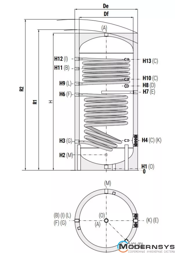 Модель оснащена двома збільшеними спіральними теплообмінниками: нижній використовується зазвичай для підключення до основного джерела тепла (наприклад, твердопаливного котла або ТН), а верхній — для допоміжного джерела або для підтримки заданої температури. Це забезпечує високу гнучкість використання та енергоефективність.