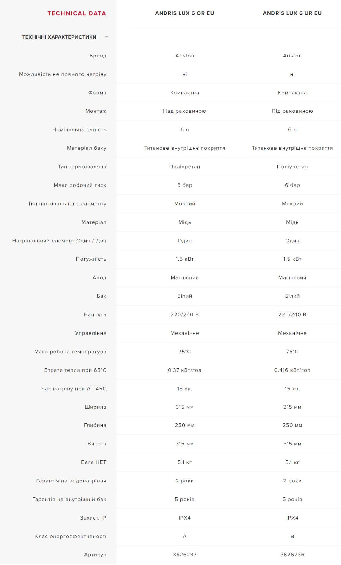 Технічні характеристики: Бойлер електричний Ariston (Аристон) ANDRIS LUX 6 UR EU