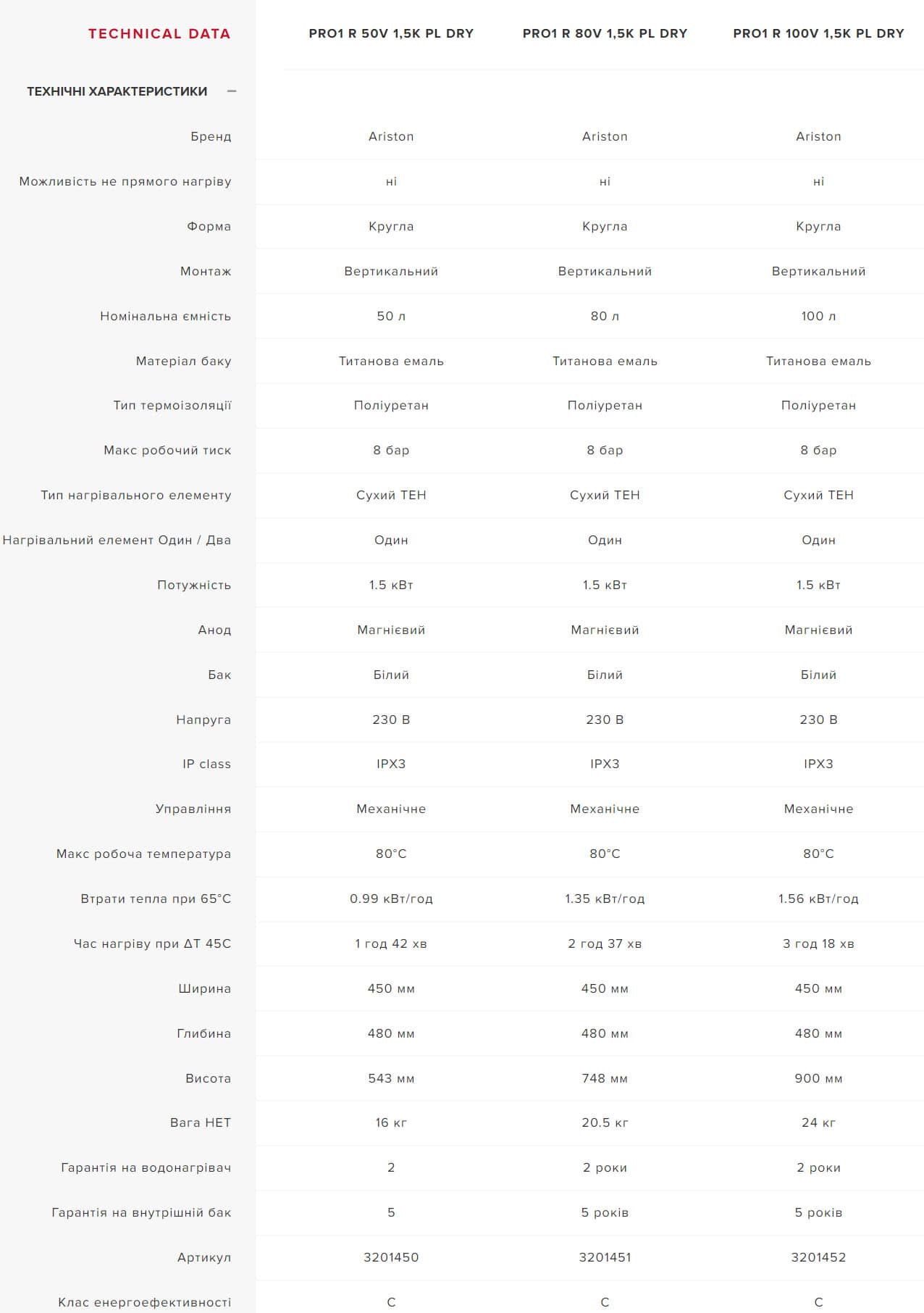 Технічні характеристики: Електричний бойлер Ariston (Аристон) PRO1 R 50 V 1,5K PL DRY