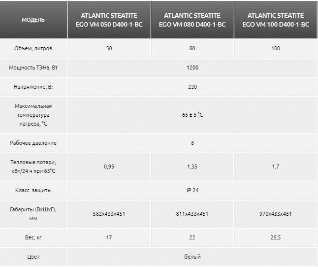 Технічні характеристики для серії електричних бойлерів Atlantic Ego Steatite D400-1-BC