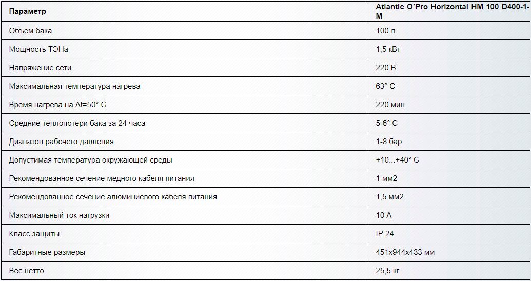 Технічні характеристики: Бойлер Atlantic (Атлантик) Horizontal HM 100 D400-1-M (1500W)