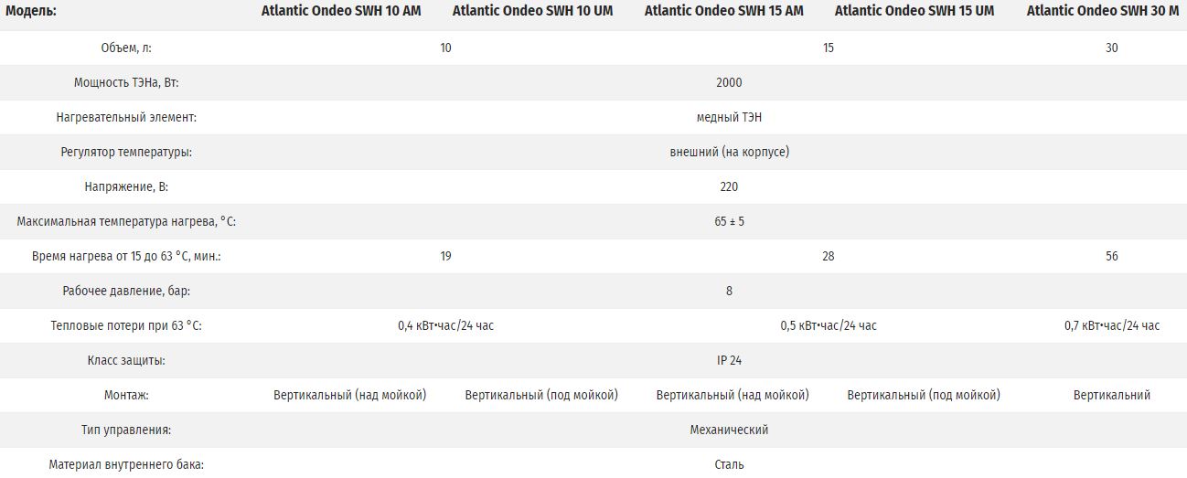 Технічні характеристики для серії електричних бойлерів Atlantic Ondeo SWH