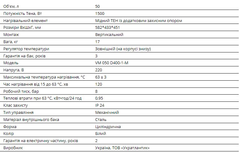 Технічні характеристики для електричного бойлера Atlantic OPRO PROFI VM 050 D400-1-M