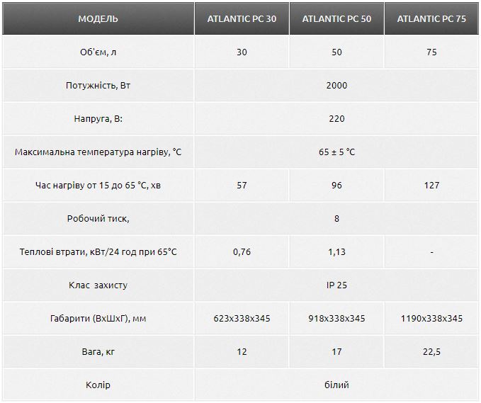 Технічні характеристики для електричних бойлерів Atlantic PC