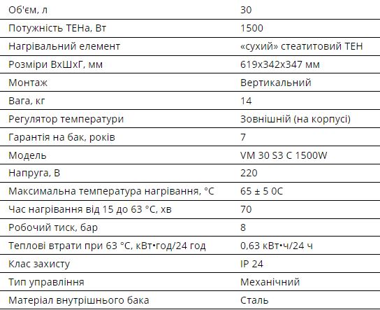Технічні характеристики для бойлера Atlantic Steatite Cube VM 30 S3