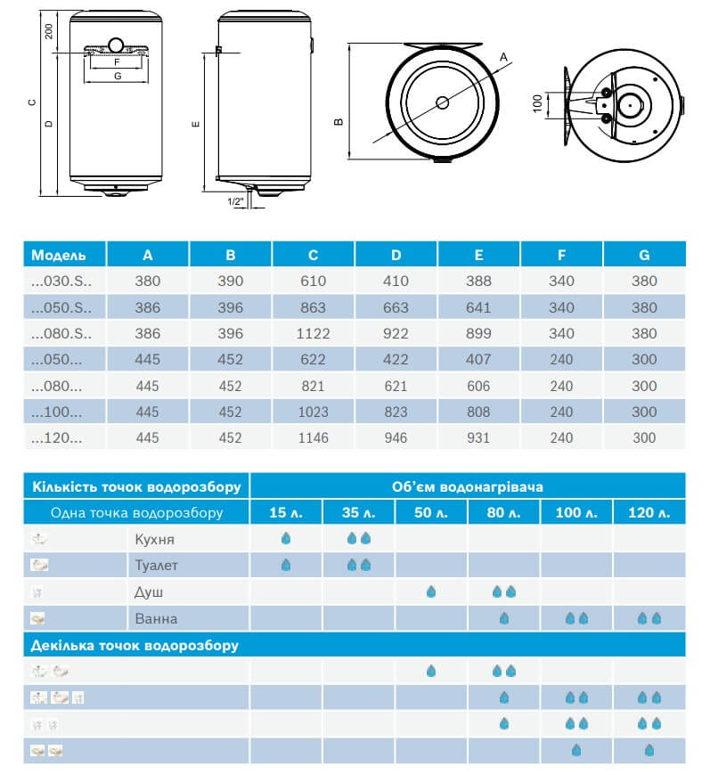 Моделі об'ємом 30 і 50 літрів типу Slim відрізняються своєю витягнутою формою і діаметром, який набагато менший за стандартний-36 см, що забезпечить розміщення водонагрівача в різних нішах і приміщеннях з обмеженим простором, наприклад, на кухні або у ванній. Також в асортименті є стандартні моделі з великим обсягом 50, 80 та 100 літрів. Ці моделі мають діаметр 47 см і вага 18, 21 та 24 кг.