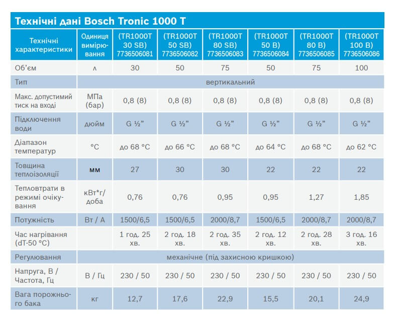 Назва товару КОД Обсяг (л) Ціна Бойлер електричний Bosch Tronic TR1000T 100 B 0000627297 519 грн Бойлер електричний Bosch Tronic TR1000T 50 B 0000627315 970 грн Бойлер електричний Bosch Tronic TR1000T 80 B 0000627306 869 грн