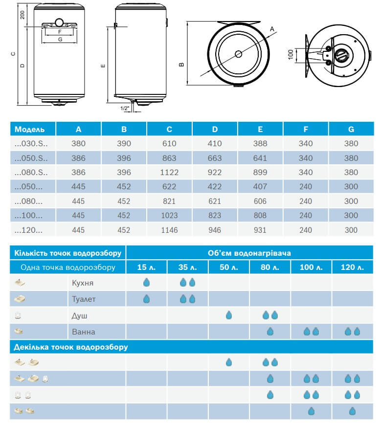Модель об'ємом 30 літрів типу Slim відрізняється своєю витягнутою формою та діаметром, який набагато менше стандартного-36 см, що забезпечить розміщення водонагрівача у різних нішах та приміщеннях з обмеженим простором, наприклад, на кухні або у ванній. Також в асортименті є стандартні моделі з великим обсягом 50, 80 та 100, 120 та 150 літрів. Ці моделі мають діаметр 47 см.