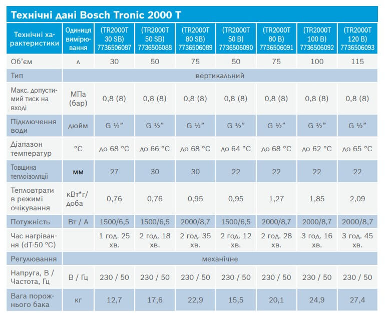 Назва товару КОД Обсяг (л) Ціна Бойлер електричний Bosch Tronic TR2000T 100 B 0000627236 783 грн Бойлер електричний Bosch Tronic TR2000T 120 B 0000627227 625 грн Бойлер електричний Bosch Tronic TR2000T 50 B 0000627255 421 грн Бойлер електричний Bosch Tronic TR2000T 80 B 0000627246 195 грн