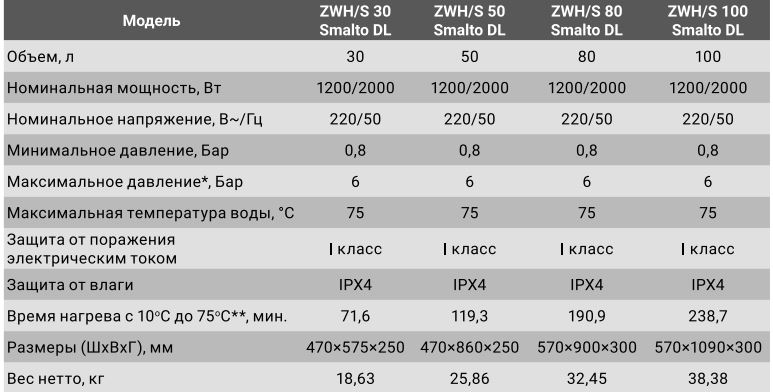 Технічні характеристики для серії електричних бойлерів Zanussi Smalto DL