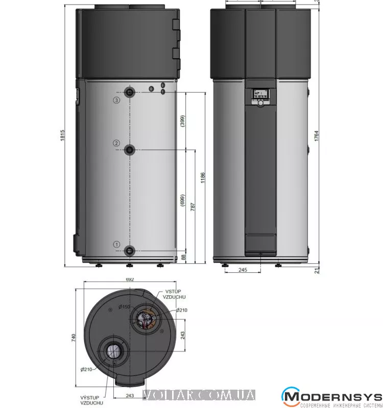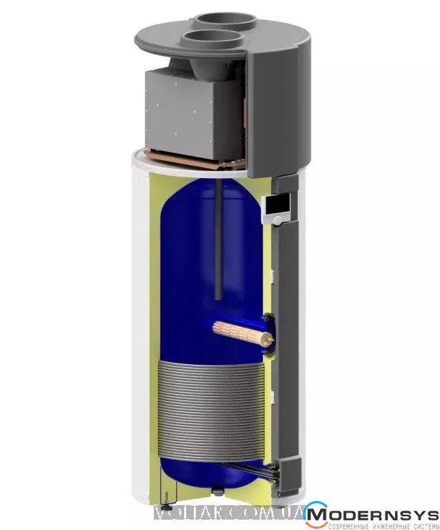- Тепловий насос розміщений у верхній частині виробу, зовнішнього блоку немає.