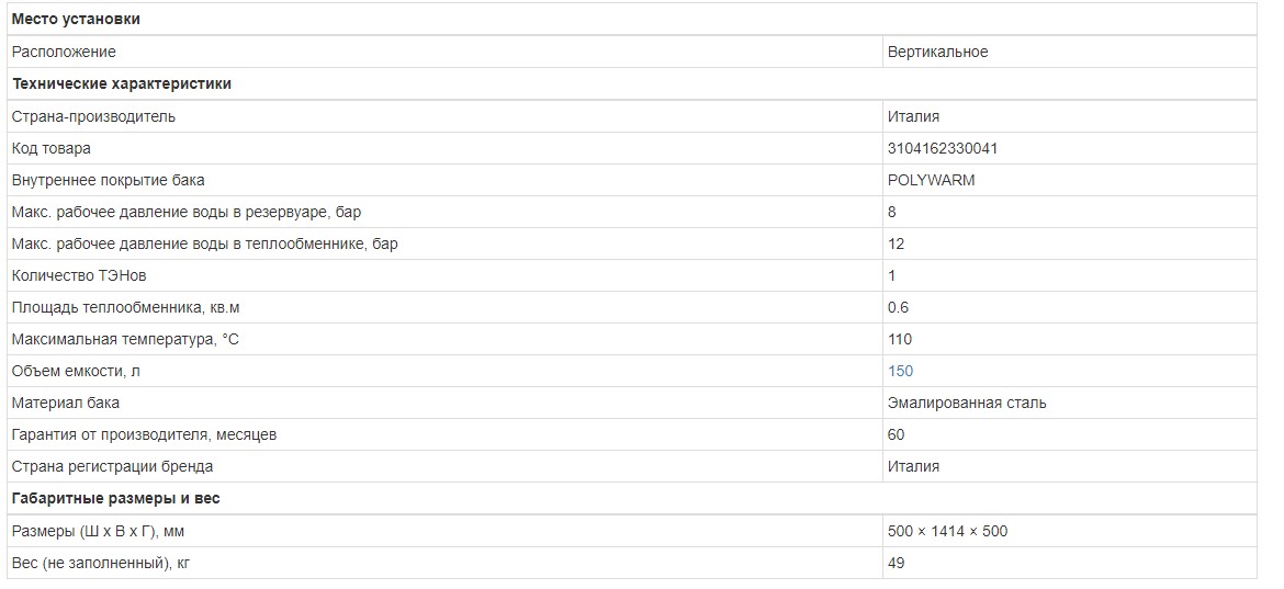 Технічні характеристики: Бойлер непрямого нагріву Cordivari (Кордивари) 150 л BOLLY 1 ST FB WB POLYWARM