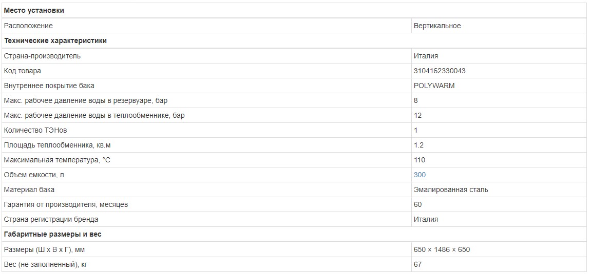Технічні характеристики: Бойлер непрямого нагріву Cordivari (Кордивари) 300 л BOLLY 1 ST FB WB POLYWARM