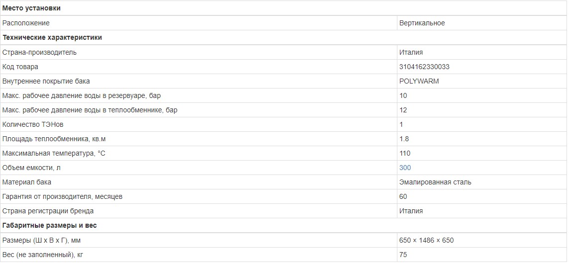 Технічні характеристики: Бойлер непрямого нагріву Cordivari (Кордивари) 300 л BOLLY 1 AP (1 збільшено ТО) WB POLYWARM