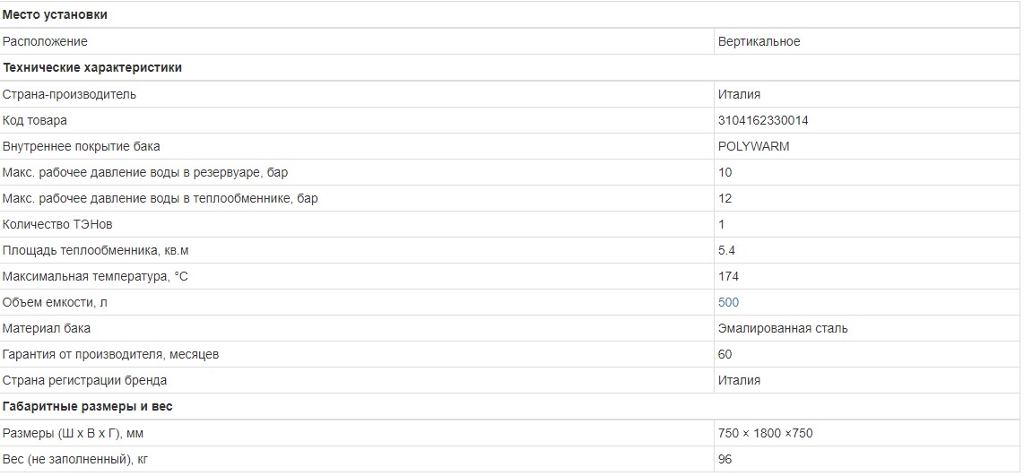 Технічні характеристики: Бойлер непрямого нагріву Cordivari (Кордивари) 500 л BOLLY 1 XL WB POLYWARM