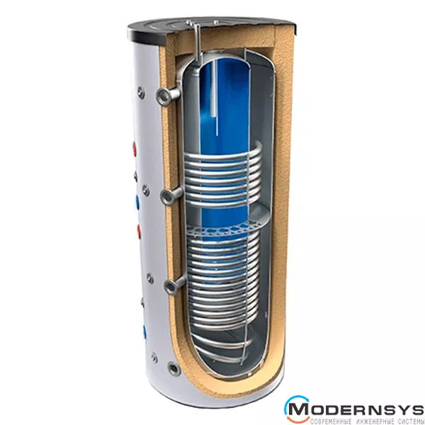 Бойлер Tesy має конструкцію "бак в баку": буферна ємність для нагрівання та внутрішній бак з водою з емальованої сталі, крім того він оснащений 2 теплообмінниками (виду "змійовик"), термометром і зовнішнім терморегулятором (опція), високоефективною теплоізоляцією, лінією рециркуляції. та великою кількістю кишень для термодатчиків. Водонагрівач має вертикальний монтаж підлоги з бічними підключеннями.