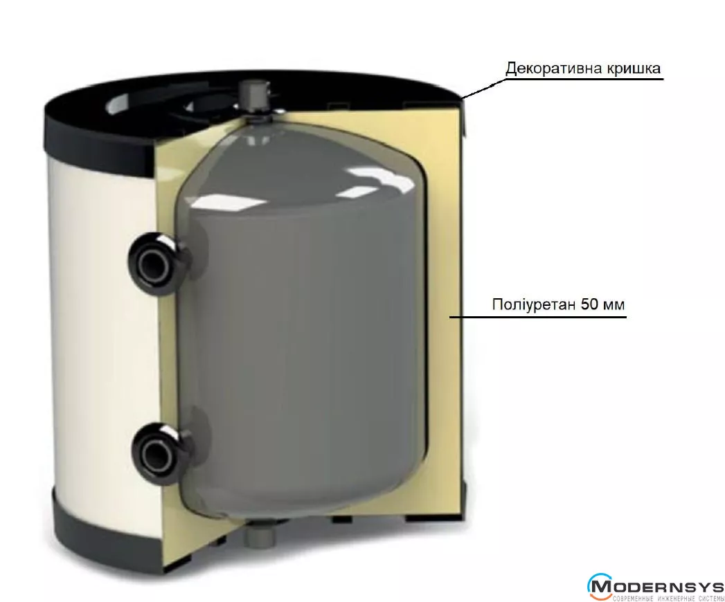 Зовні буферна ємність покривається шаром спіненого твердого поліуретану товщиною 50 мм, який виконує роль ефективної теплоізоляції та значно знижує втрати тепла з буферної ємності в приміщенні, де вона встановлена.