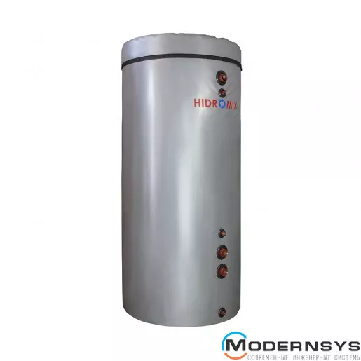 Буферна ємність Hidromix може працювати для системи опалення або гарячого водопостачання під зайвим тиском теплоносія до 3 бар. Виготовлена із чорної сталі високої якості, з товщиною стінки 3 мм, без внутрішнього покриття. Всі з'єднувальні патрубки мають внутрішнє різьблення: 3 патрубки підключення до системи: 1 1/2", 2 патрубки для підключення теплообмінника: 1"; патрубок виходу повітря, 2 патрубки підключення термометрів, зливний патрубок: 1/2". Буферна ємність має теплообмінник з нержавіючої сталі, який розташований у верхній частині бака і призначений для приготування води для системи опалення.