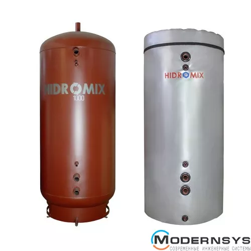 Буферна ємність (теплоакумулятор) Hidromix, застосовується для накопичення тепла, що виділяється при роботі котла на твердому паливі, каміна з водяною сорочкою, сонячних панелей, теплового насоса або електричного котла, що працюють в умовах оптимального горіння. Це вертикально розміщений довгастий бак, об'ємом – від 300 до 5000 л, з набором входів та виходів, через які підводиться та виводиться теплоносій. Можна використовувати в приватних та промислових опалювальних системах.