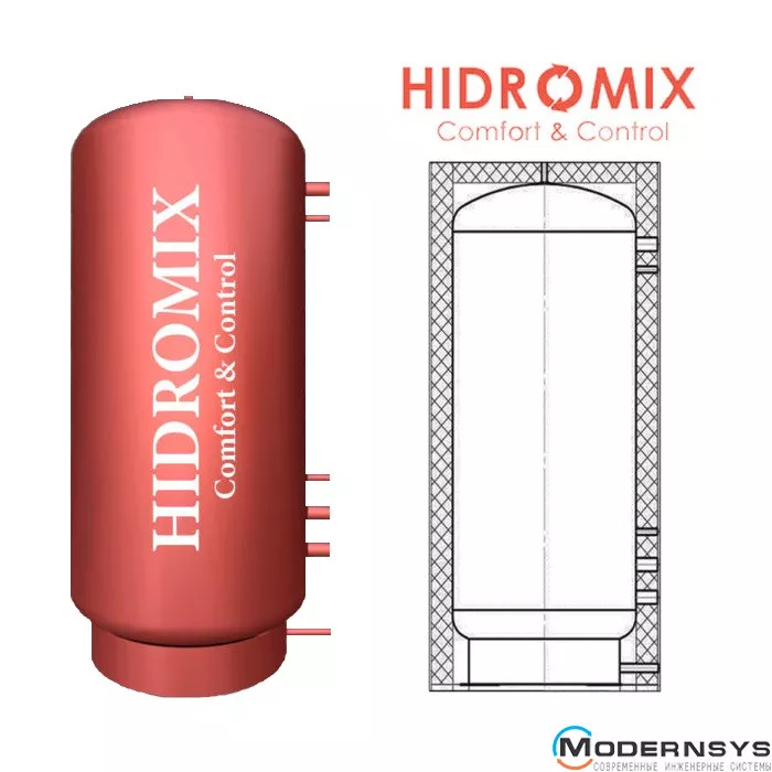 Буферна ємність (теплоакумулятор) Hidromix, застосовується для накопичення тепла, що виділяється при роботі котла на твердому паливі, каміна з водяною сорочкою, сонячних панелей, теплового насоса або електричного котла, що працюють в умовах оптимального горіння. Це вертикально розміщений довгастий бак, об'ємом – від 300 до 5000 л, з набором входів та виходів, через які підводиться та виводиться теплоносій. Можна використовувати в приватних та промислових опалювальних системах.