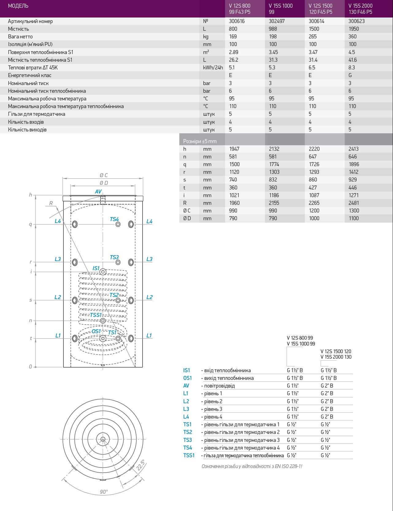 Технічні характеристики: Буферна ємність із теплообмінником Tesy (Теси) 1500 л. - V 12 S 1500120 F45 P5 C