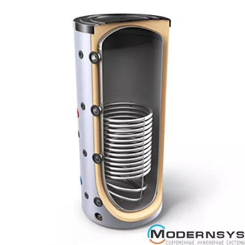 Акумулятор тепла великого об'єму, оснащений внутрішнім баком зі сталі без покриття, вбудованим теплообмінником (виду "змійовик"), зовнішнім термоіндикатором, високоефективною теплоізоляцією з пінополіуретану товщиною 50 мм, PVC кожухом, захисним клапаном. Накопичувач відрізняється вузьким дизайном і має вертикальну установку для підлоги.