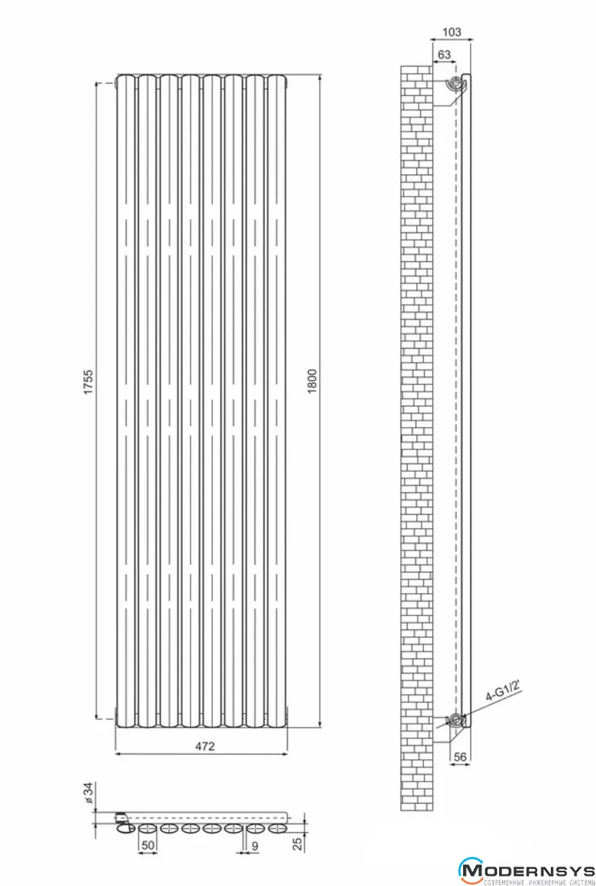 Технічні характеристики: Дизайнерський вертикальний радіатор ARTTIDESIGN (Арттидизайн) Rimini 8/1800/472/50 чорний матовий