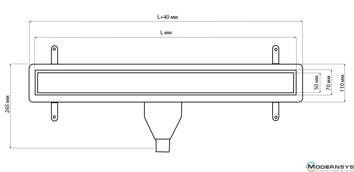 Технічні характеристики: Душовий канал MCH (МЦШ) 900 мм із нержавіючої сталі AISI 304 з решіткою під плитку, сухий сифон, горизонтальний випуск