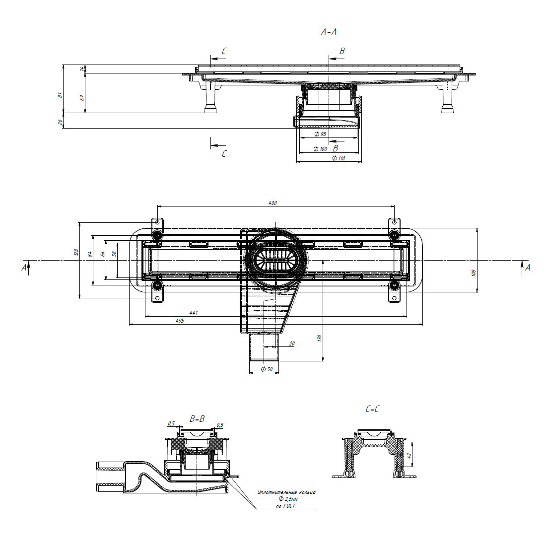 - комплектація: душовий канал - 1 шт, сифон - 1 шт, ґрати для волосся 1 шт, ніверсальна двостороння накладка з нержавіючої сталі 1 шт, гідроізоляційні стрічки 4 шт, монтажний набір для кріплення регульованих ніжок: шуруп D 3,5x35мм - 4 шт. , дюбель 6х35 мм - 4 шт, регульовані ніжки - 4 шт