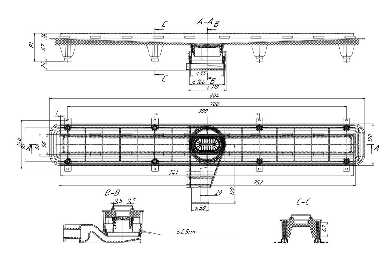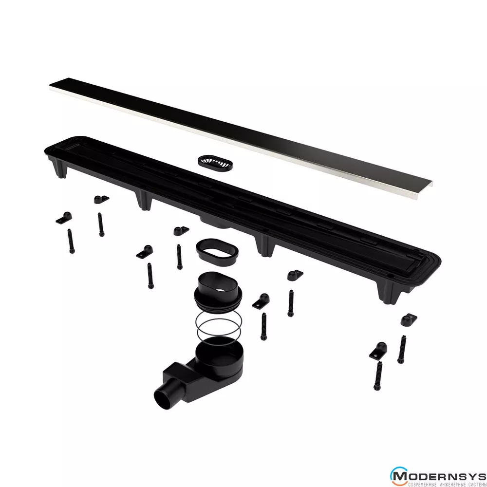 - комплектація: душовий канал - 1 шт, сифон - 1 шт, ґрати для волосся 1 шт, ніверсальна двостороння накладка з нержавіючої сталі 1 шт, гідроізоляційні стрічки 4 шт, монтажний набір для кріплення регульованих ніжок: шуруп D 3,5x35мм - 8 шт. , Дюбель 6х35 мм - 8 шт, регульовані ніжки - 8 шт