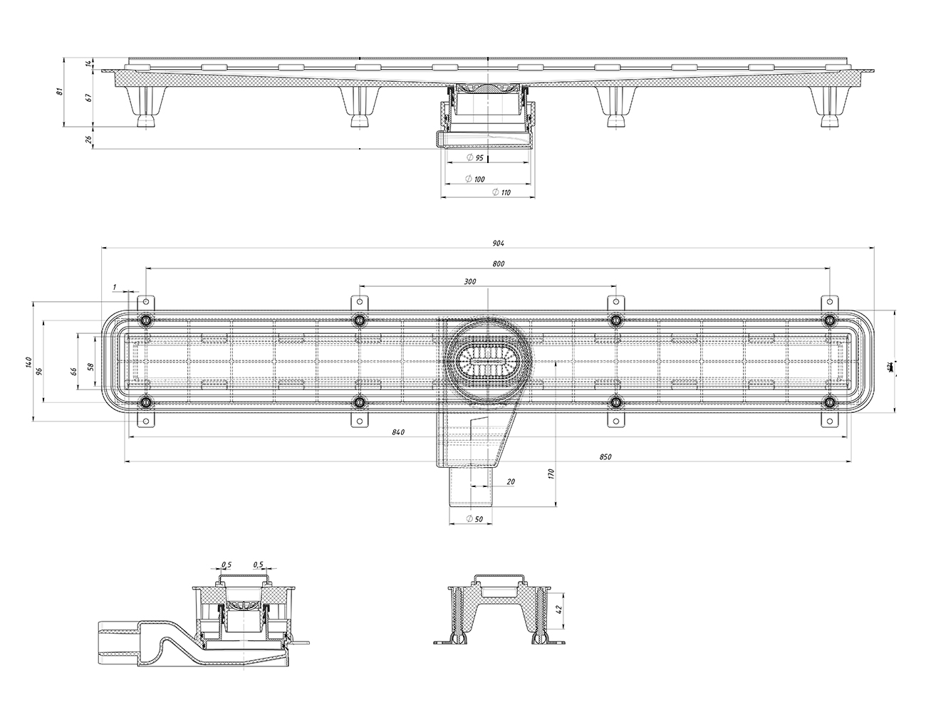 - комплектація: душовий канал - 1 шт, сифон - 1 шт, ґрати для волосся 1 шт, ніверсальна двостороння накладка з нержавіючої сталі 1 шт, гідроізоляційні стрічки 4 шт, монтажний набір для кріплення регульованих ніжок: шуруп D 3,5x35мм - 8 шт. , Дюбель 6х35 мм - 8 шт, регульовані ніжки - 8 шт