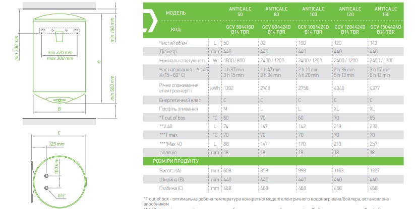 Технічні характеристики: Електричний бойлер Tesy (Теси) ANTICALC серія B14 80 л. - GCV 804424D B14 TBR