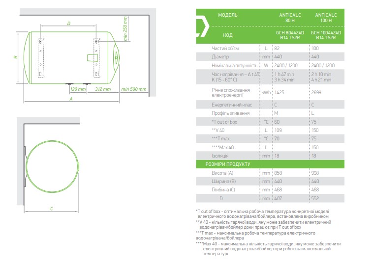 Технічні характеристики: Електричний бойлер Tesy (Теси) ANTICALC slim серія B14 100 л. - GCH 1004424D B14 TBR