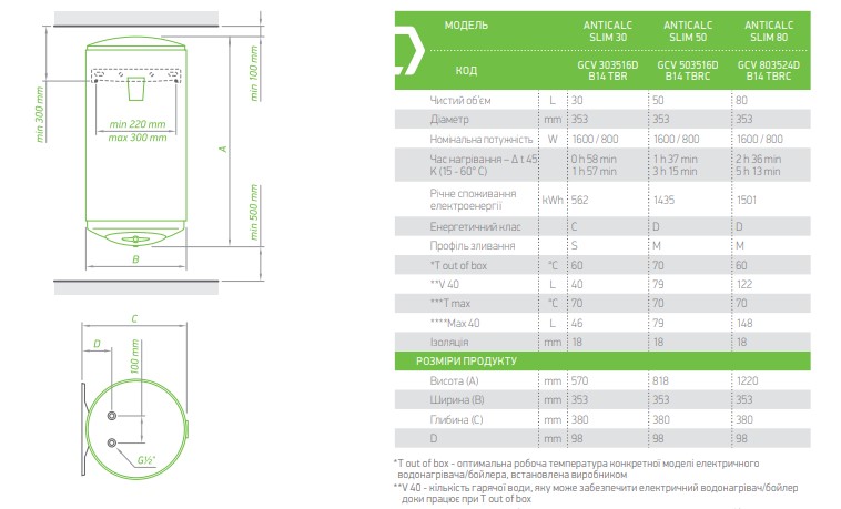 Технічні характеристики: Електричний бойлер Tesy (Теси) ANTICALC slim серія B14 80 л. - GCV 803516D B14 TBR