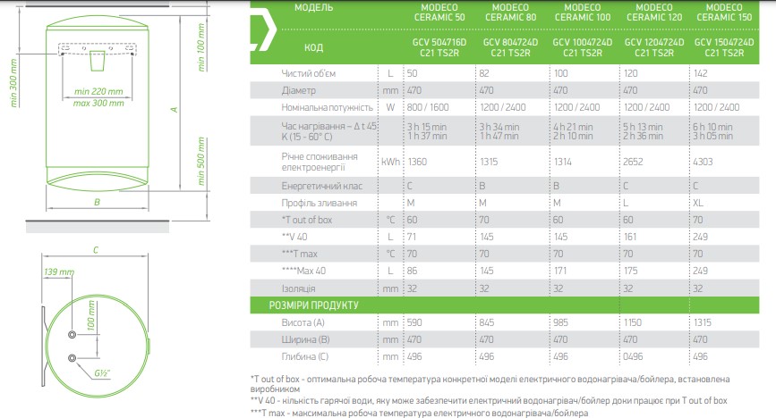 Технічні характеристики: Електричний бойлер Tesy (Теси) Modeco Ceramic 150 л. - GCV 1504724D C21 TS2RC