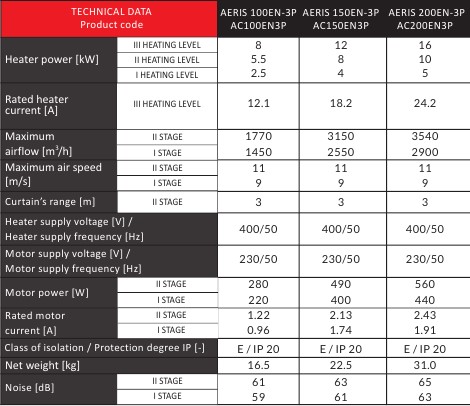 Технічні характеристики: Електрична завіса Reventon (Ревентон) AERIS 200EN-3P