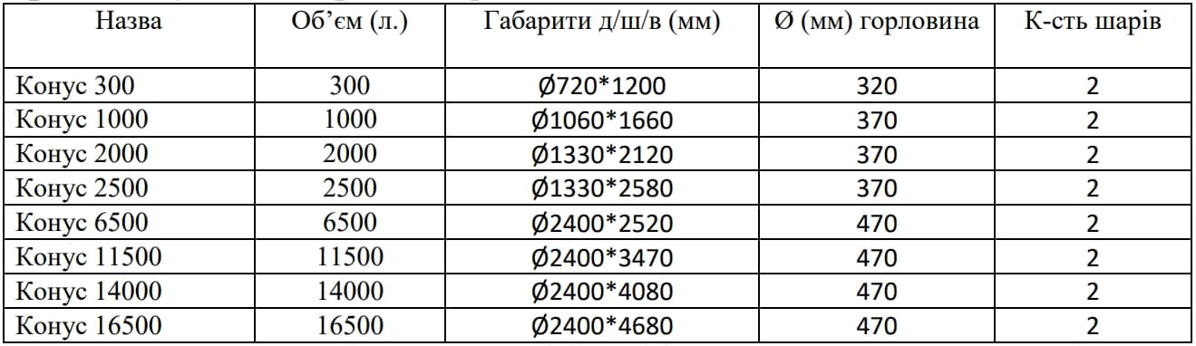 Ємність пластикова з конусним дном двошарова. Виконана з двошарового пластику, зовнішній шар якої складається з міцного і міцного технічного пластику, а внутрішній шар складається з харчового полімеру. Тільки для наземного стаціонарного використання не підходить для перевезення.
