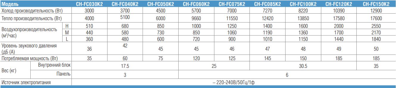 Технічні характеристики для серії касетних фанкойлів Cooper&Hunter