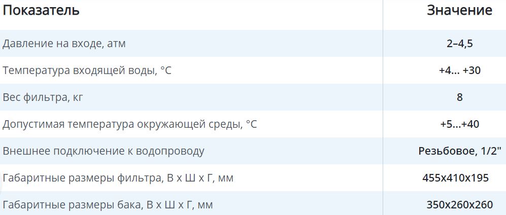Технічні характеристики для фільтра зворотного осмосу Ecosoft Standard