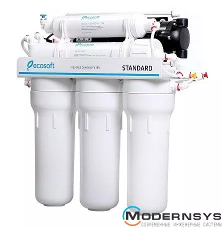 Фільтр зворотного осмосу ЕКОСОФТ СТАНДАРТ з помпою призначений для очищення води на молекулярному рівні в будинках та квартирах із слабким натиском у трубопроводі.