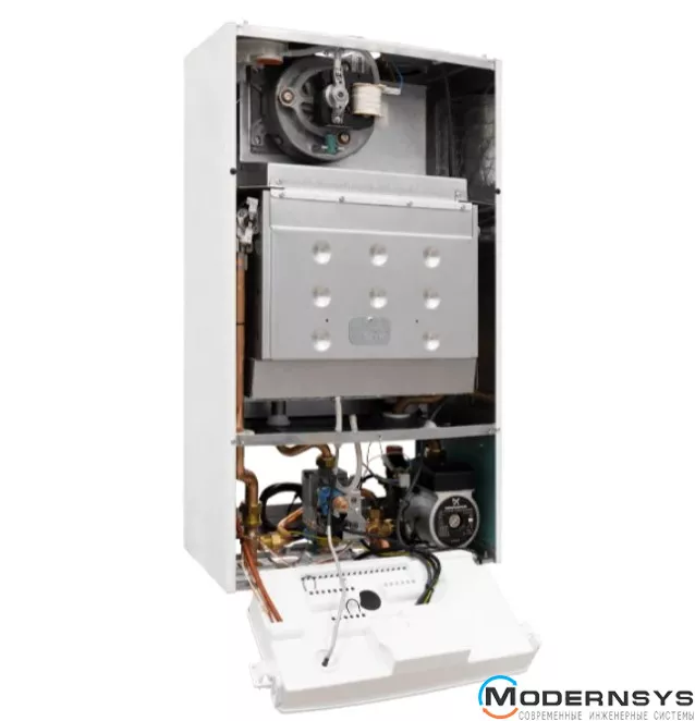 - Інтегральна гідравлічна група, що складається з автоматичного байпасу, клапана безпеки, датчика тиску, крана підживлення та підключення розширювального бака;
