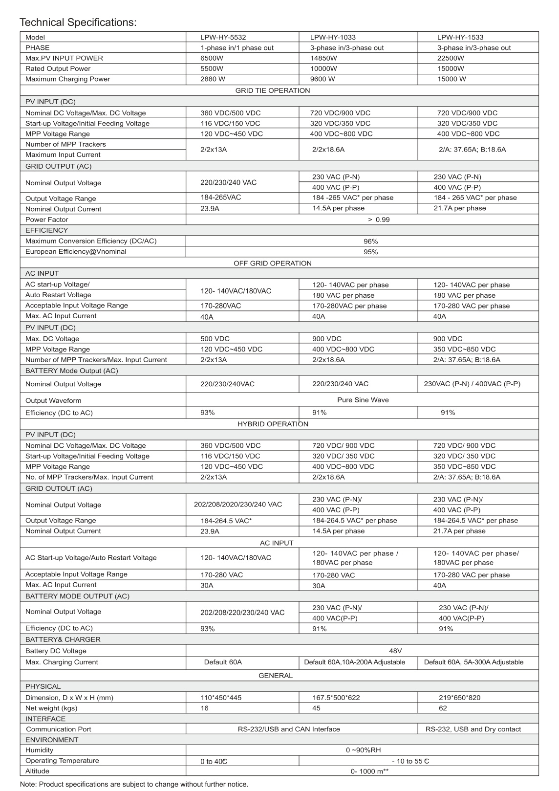 Модель LPW-HY-1033 - 3 фазний ON-OFF GRID гібридного типу має оптимальні технічні характеристики та дозволяє виробляти заряд акумуляторних батарей як від загальної мережі, так і від альтернативних джерел живлення (сонячна енергія, вітрогенератор).