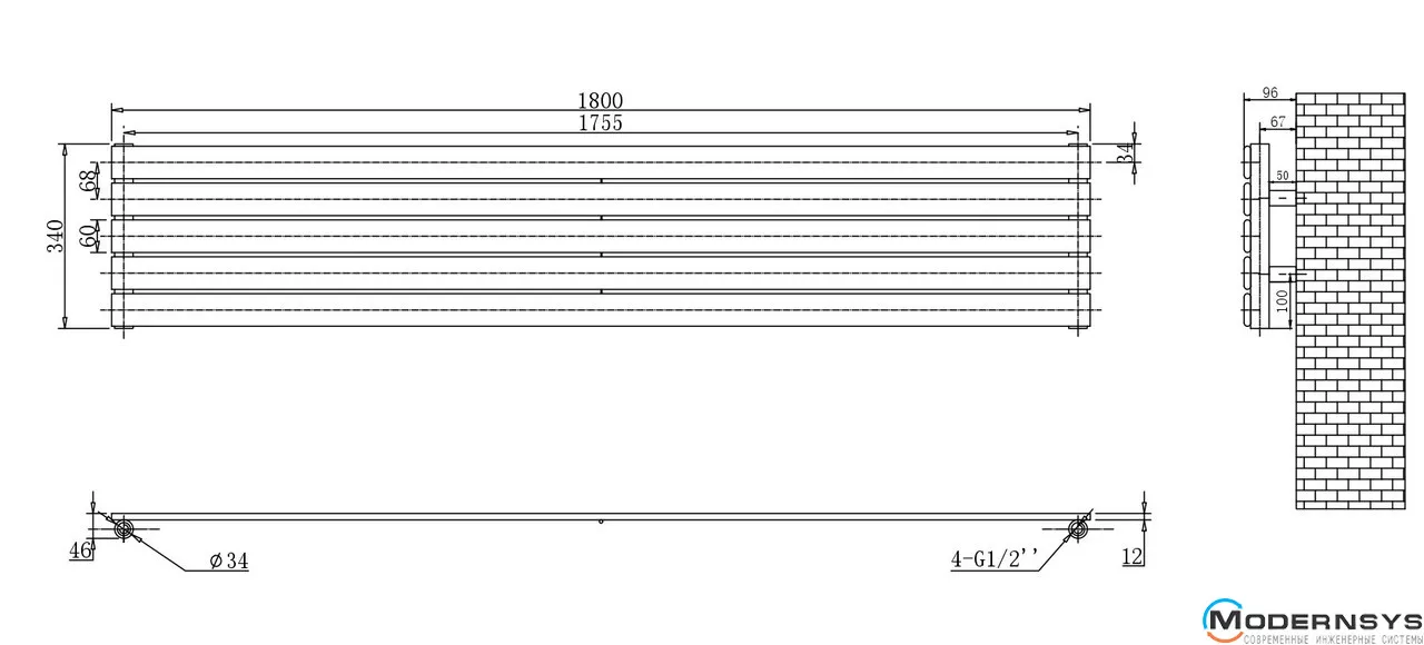Розмір: висота - 340 мм. ширина - 1800 мм. Підключення нижнє 1755 мм Потужність: 1070 ват при 65 градусів Площа: 10 м2. >
